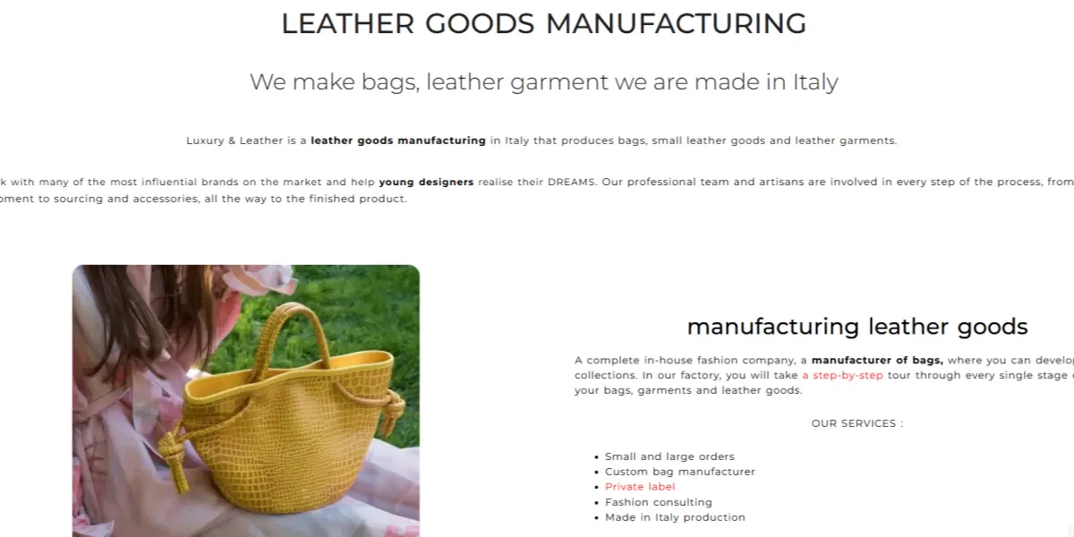 Meilleur choix pour : les marques qui ont besoin d'un fabricant de sacs à main de marque privée en Italie avec une expérience dans la gestion de plusieurs profils de clients et marchés d'exportation.